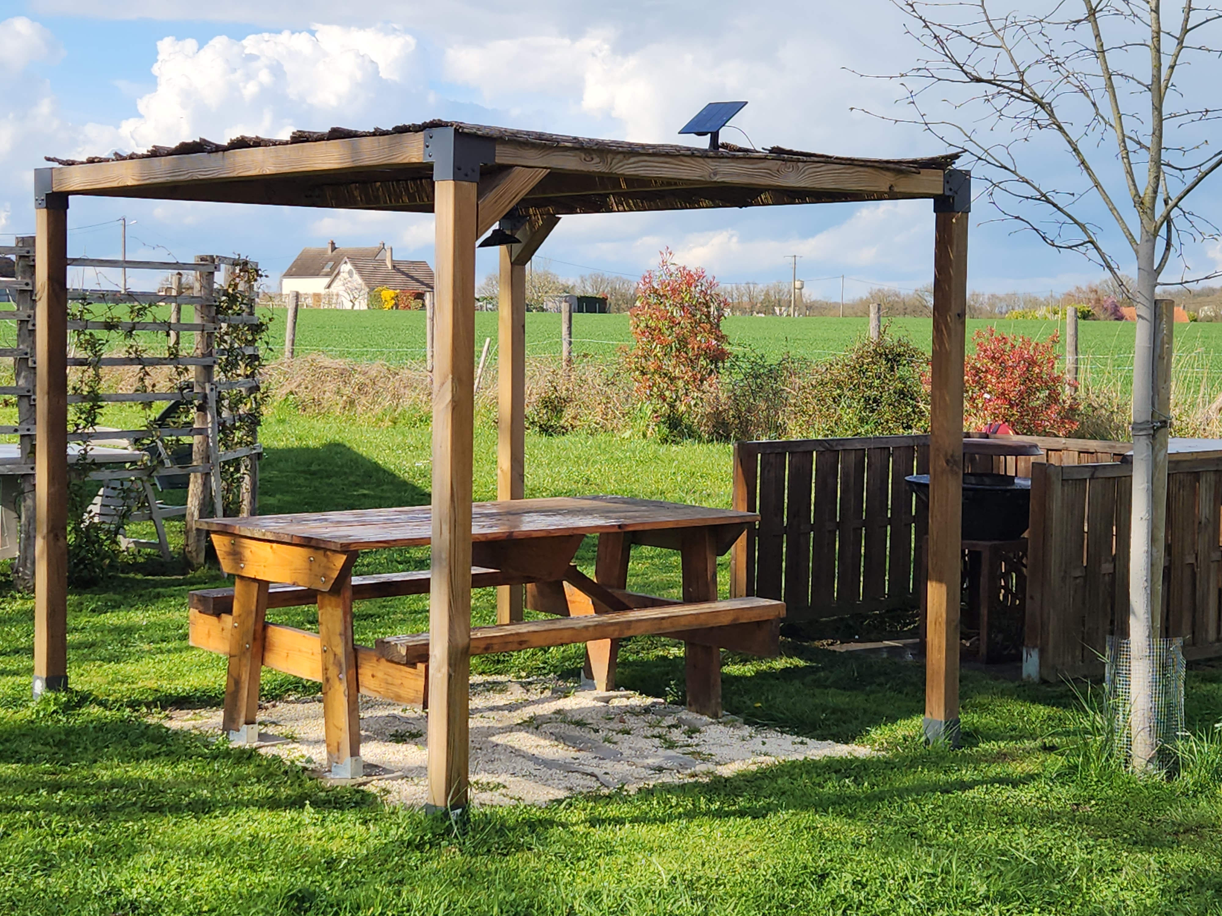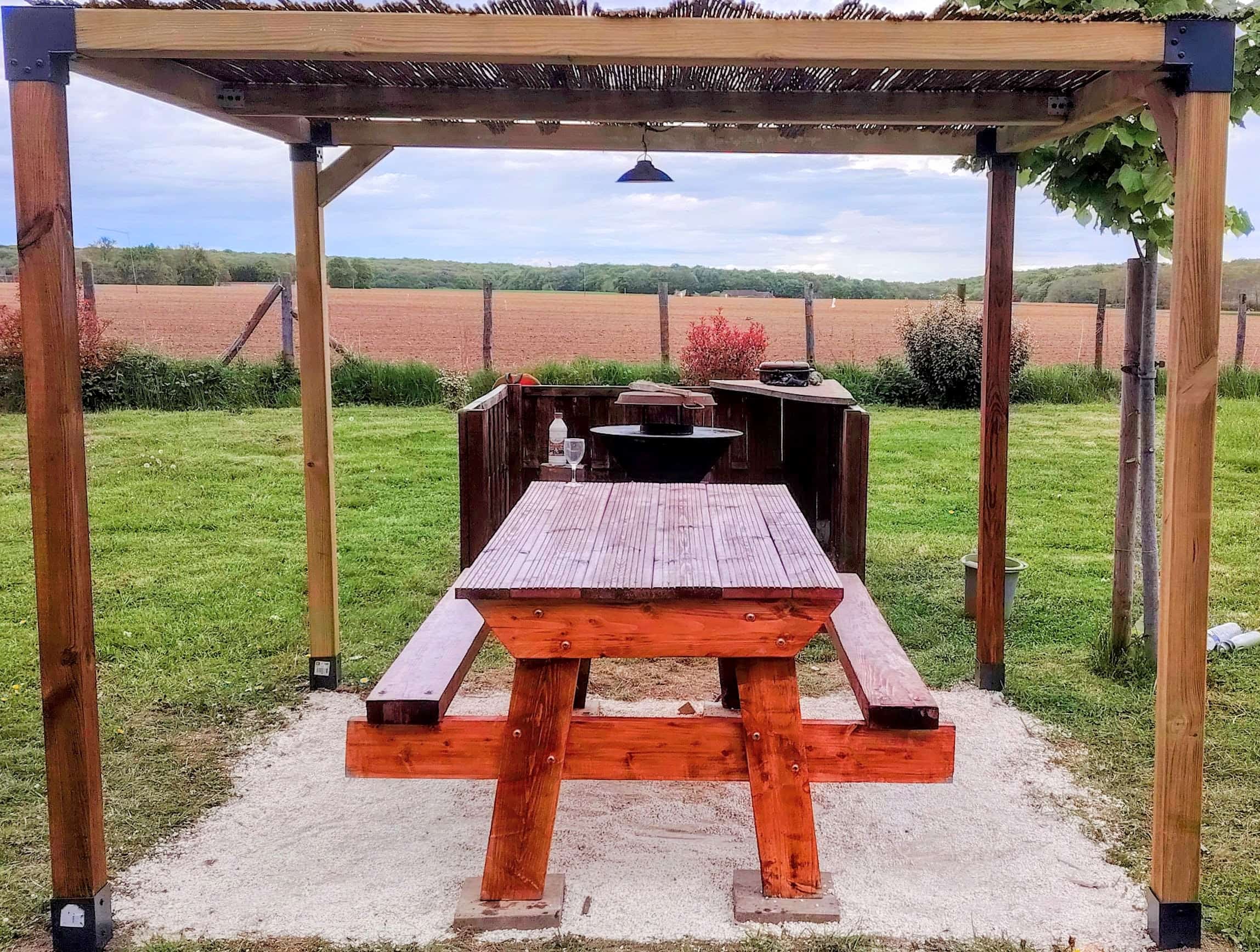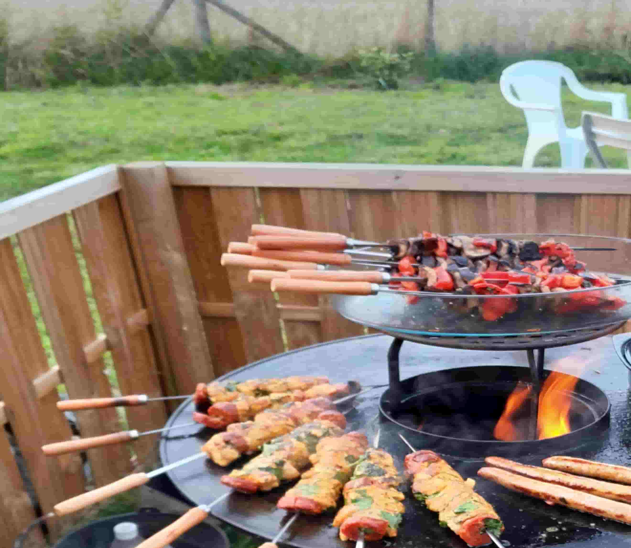 À l'extérieur, une table de jardin vous permet de profiter de repas en plein air, tandis que le braséro-plancha promet des soirées conviviales sous les étoiles.